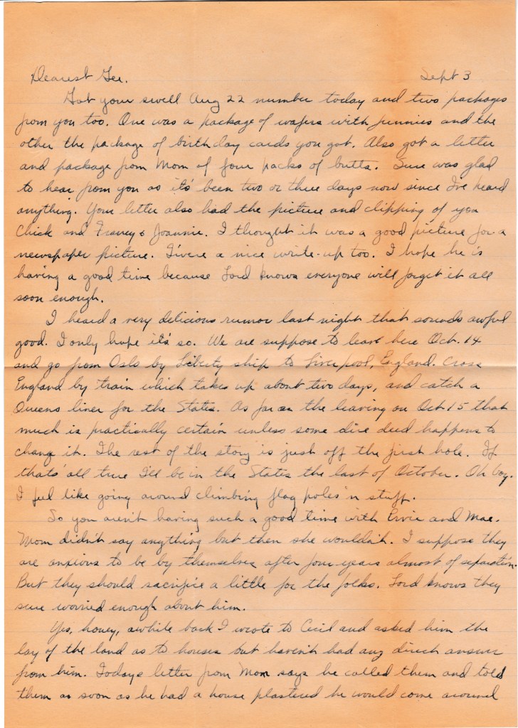 I heard a very delicious rumor last night that sounds awful good. I only hope it’s so. We are suppose to leave here Oct. 14 and go from Oslo by Liberty ship to Liverpool, England. Cross England by train, which takes up about two days, and catch a Queen’s liner for the States. As far as the leaving on Oct 15 that much is practically certain unless some dire deed happens to change it. The rest of the story is just off the first hole. If that’s all true, I’ll be in the States the last of October. Oh boy. I feel like going around climbing flagpoles ’n stuff.