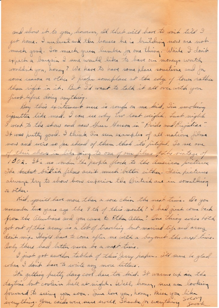 Boy, this excitement sure is rough on me, kid, I’m smoking cigarettes like mad. I can see why Erv lost weight. Last night I went to the show and saw Greer Garson in “Pride and Prejudice”. It was pretty good. I think I’ve seen examples of all nations film snow and we’re so far ahead of them that it’s pitiful. To see one of their shows is like going to see one of our films of the vintage of 1902. It’s no wonder the people flock to the American pictures. The British films aren’t much better either. Their pictures always try to show how superior the British are in something or other.