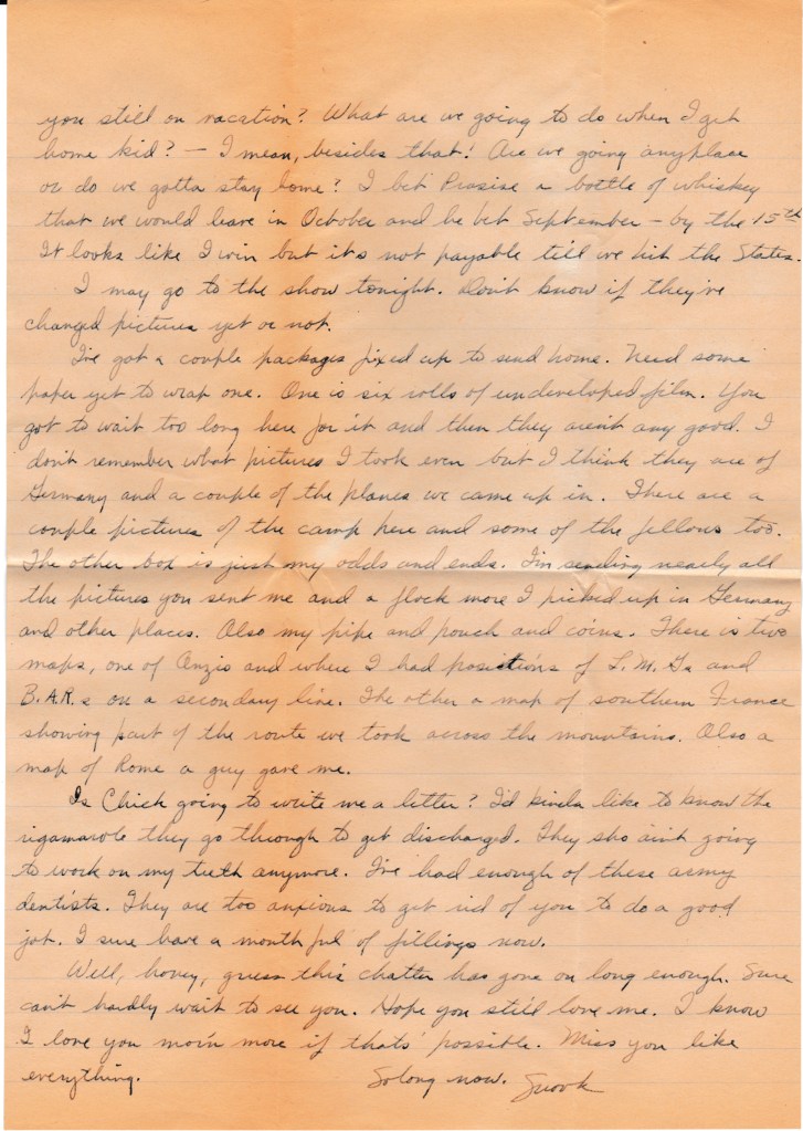 I’ve got a couple packages fixed up to send home. Need some paper yet to wrap one. One is six rolls of undeveloped film. You got to wait too long here for it and the they aren’t any good. I don’t remember what pictures I took even but I think they are of Germany and a couple of the planes we came up in. There are a couple pictures of the camp here and some of the fellows too. The other box is just my odds and ends. I’m sending nearly all the pictures you sent me and a flock more I picked up in Germany and other places. Also my pipe and pouch and coins. There is two maps, one of Anzio and where I had positions of LMGs and BARs on a secondary line. The other a map of southern France showing part of the route we took across the mountains. Also a map of Rome a guy gave me.
