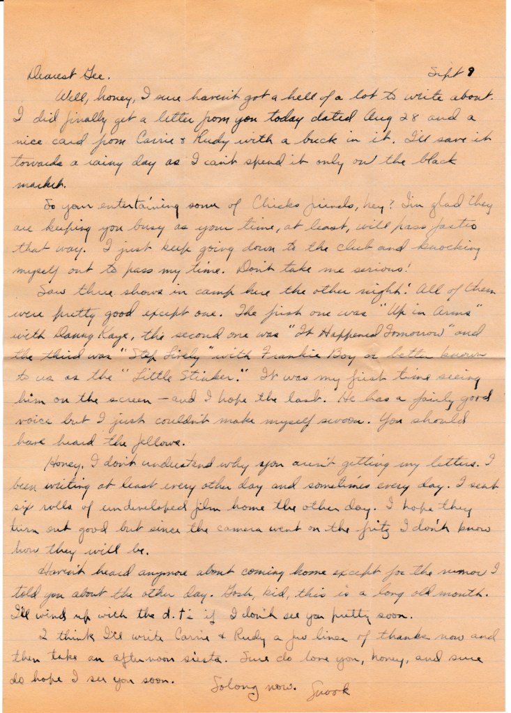 Well, honey, I sure haven’t got a hell of a lot to write about. I did finally get a letter from your today dated Aug 28 and a nice card from Carrie + Rudy with a buck in it. I’ll save it towards a rainy day as I can’t spend it, only on the black market.