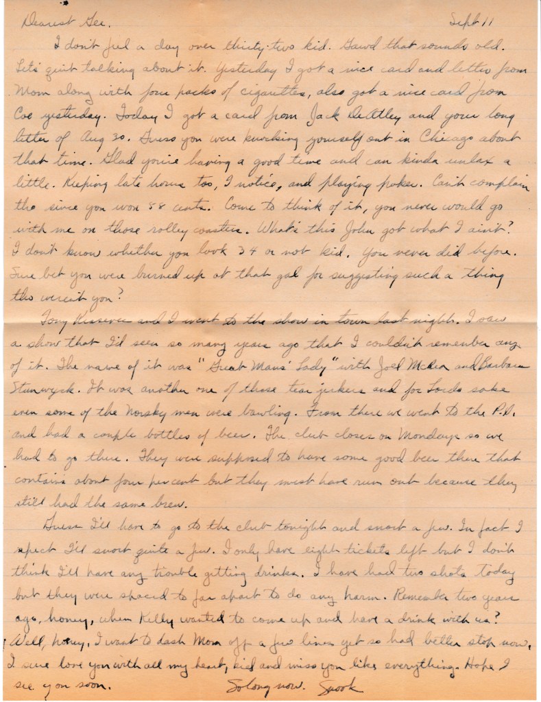 I don’t feel a day over thirty-two kid. Gawd that sounds old. Let’s quit talking about it. Yesterday I got a nice card and letters from Mom along with four packs of cigarettes, also got a nice card from Coe yesterday. Today I got a card from Jack DeAtley and your long letter of Aug. 30. Guess you were knocking yourself out in Chicago about that time. Glad you’re having a good time and can kinda unlax a little. Keeping late hours too, I notice, and playing poker. Can’t complain tho since you won 88 cents. Come to think of it, you never would go with me on those rolley coasters. What’s this John got what I ain’t? I don’t know whether you look 34 or not kid. You never did before. Sure bet you were burned up at that gal for suggesting such a thing tho weren’t you.