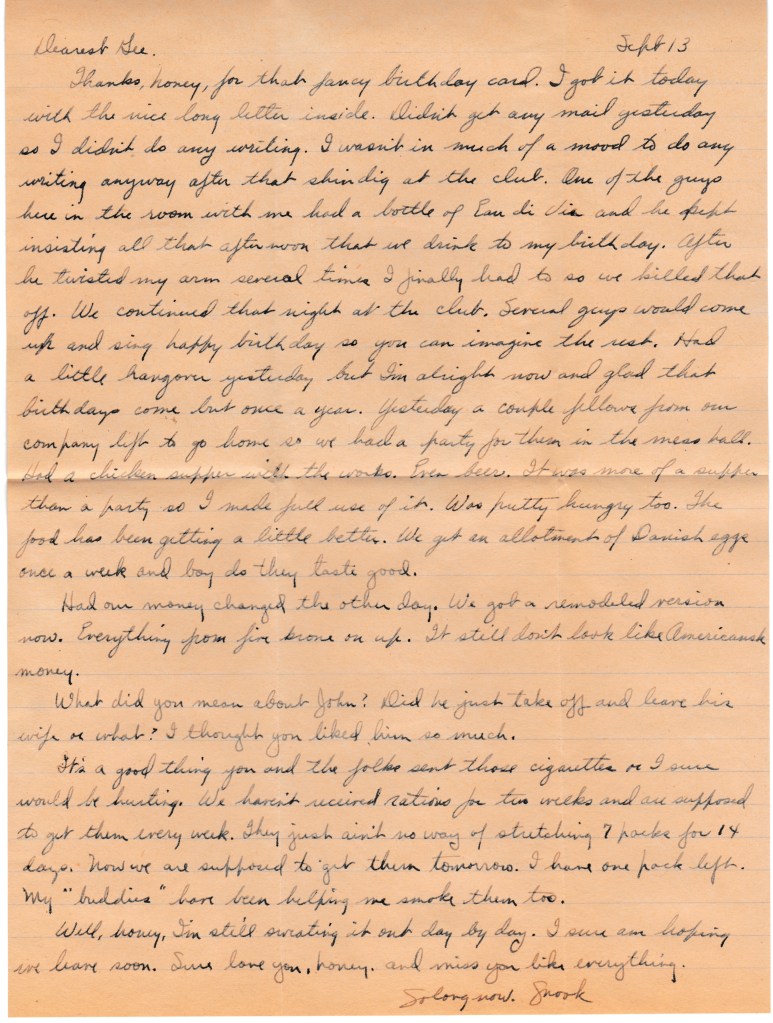 Thanks, honey, for that fancy birthday card. I got it today with the nice long letter inside. Didn’t get any mail yesterday so I didn’t do any writing. I wasn’t in much of a mood to do any writing anyway after that shindig at the club. One of the guys here in the room with me had a bottle of Eau di Vin and he kept insisting all that afternoon that we drink to my birthday. After he twisted my arm several times I finally had to so we killed that off. We continued that night at the club. Several guys would come up and sing happy birthday so you can imagine the rest. Had a little hangover yesterday but I’m alright now and glad that birthday come but once a year. Yesterday a couple fellows from our company left to go home so we had a party for them in the mess hall. Had a chicken supper with the works. Even beer. It was more of a supper than a party so I made full use of it. Was pretty hungry too. The food has been getting a little better. We get an allotment of Danish eggs once a week and boy do they taste good.