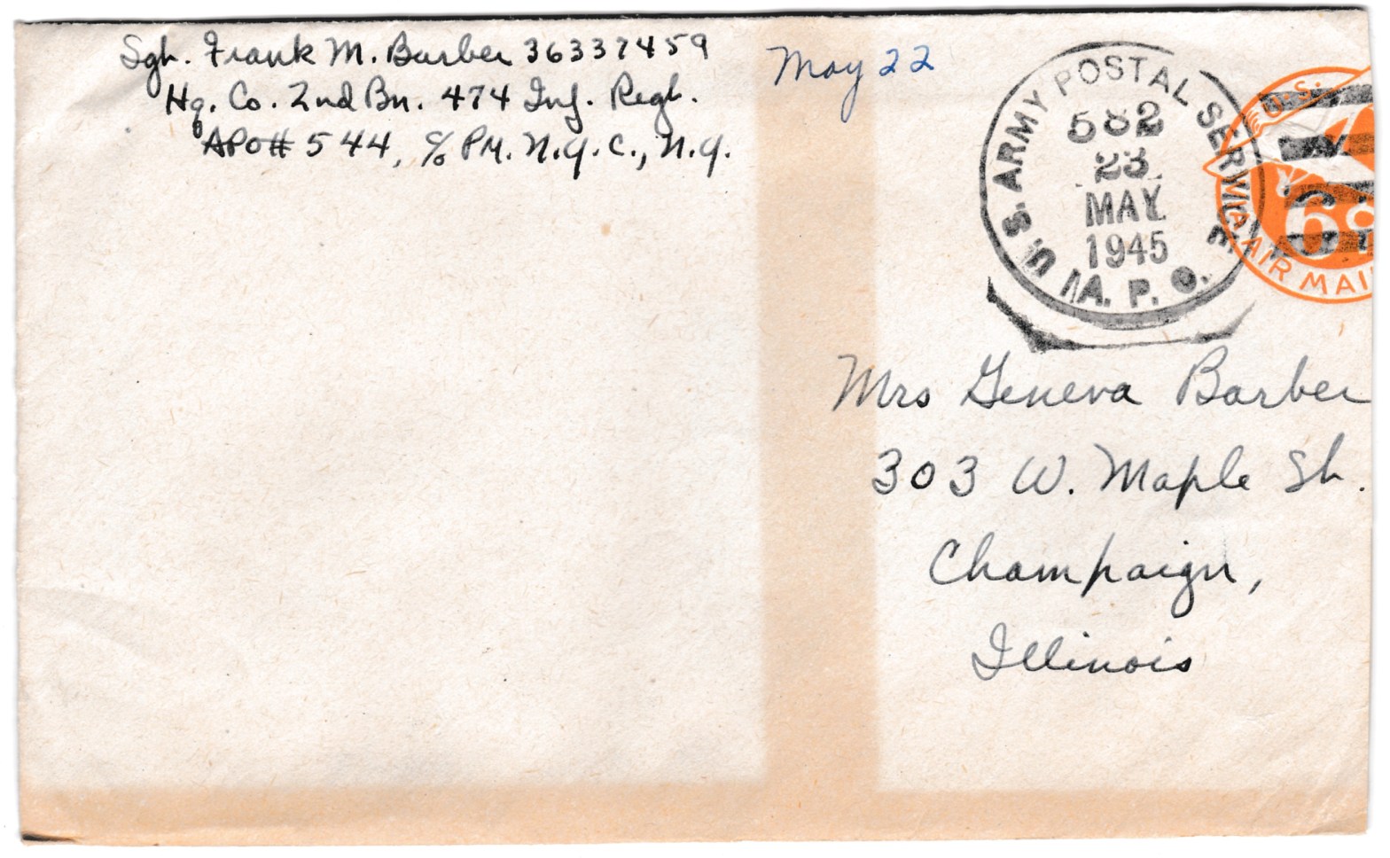 (Note: this letter and the one following tomorrow are dated the same, but only the following/tomorrow’s seems to have been written on the 27th. I believe this letter precedes the next one, but it is possible it follows instead). Dearest Gee. Got your May 2 jobby today and a swell package. It had candy bars,Continue reading “Saturday, May 26, 1945”