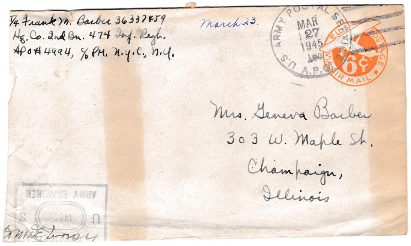 Dearest Gee. Well, I hit the jackpot again today, honey. I got your two letters dated Feb. 29 and March 5, one from Sis, one from L. Harry, and one from the War Department. Yours were a v-mail and an Easter card with a letter in it four double-pages long. Was that ever a doozy!Continue reading “Wednesday, March 21, 1945”