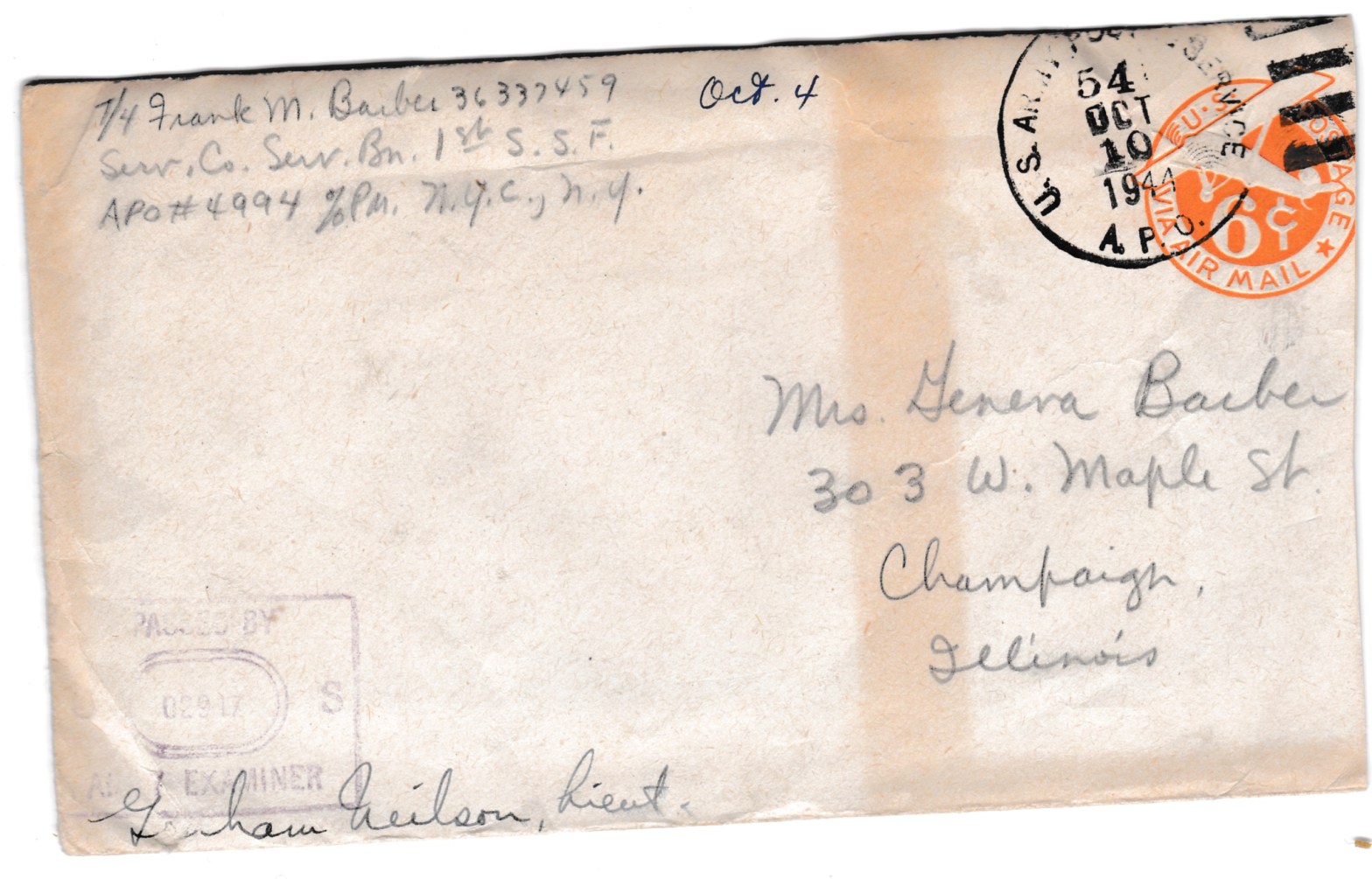 Dearest Gee. Got eleven letters yesterday and one from you the day before so I feel right good. Yours were four air jobbies and a v-mail of the 4, 6, 7, 11th and 12. Got a nice card from Jenny and one from Claude and Mildred. Got v-mails from Mom, Sis, and Mae. Two lettersContinue reading “Wednesday, October 4, 1944”